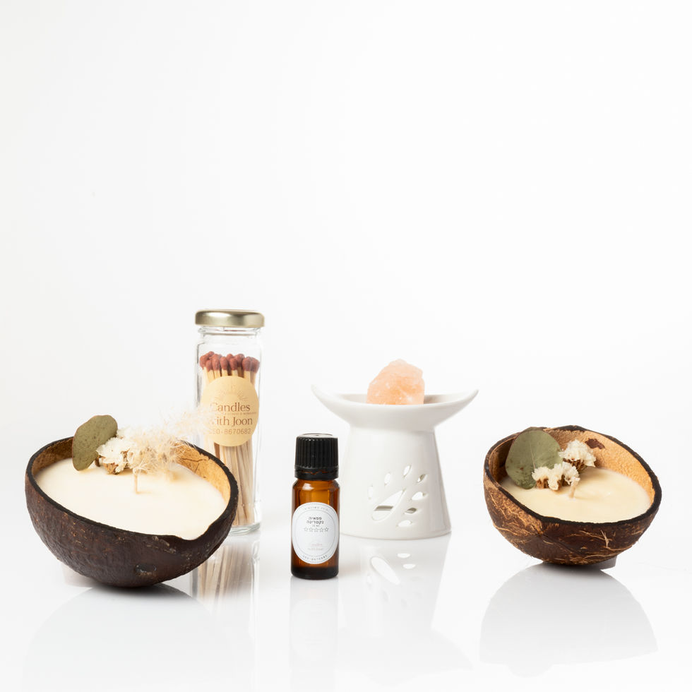 שני נרות עשויים שעוות סויה טבעונית בניחוחות האיים הטרופיים, פתילי כותנה, לשיפור איכות הבעירה, יצוקים לכלי קוקוס טבעיים.
